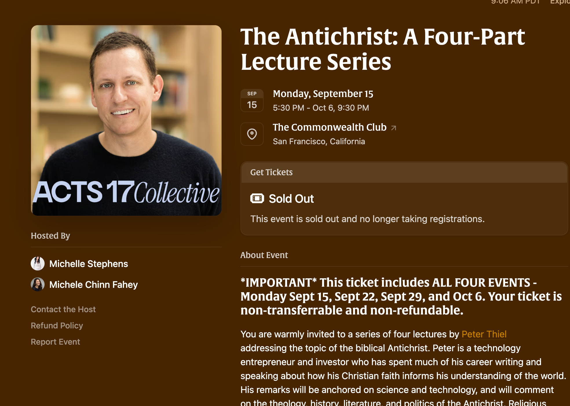 Just when you thought it couldn’t get any weirder, Peter Thiel has announced plans to deliver a four-part lecture series on the Antichrist. These unusual events will take place at the Commonwealth Club of San Francisco on four days in September and October.
